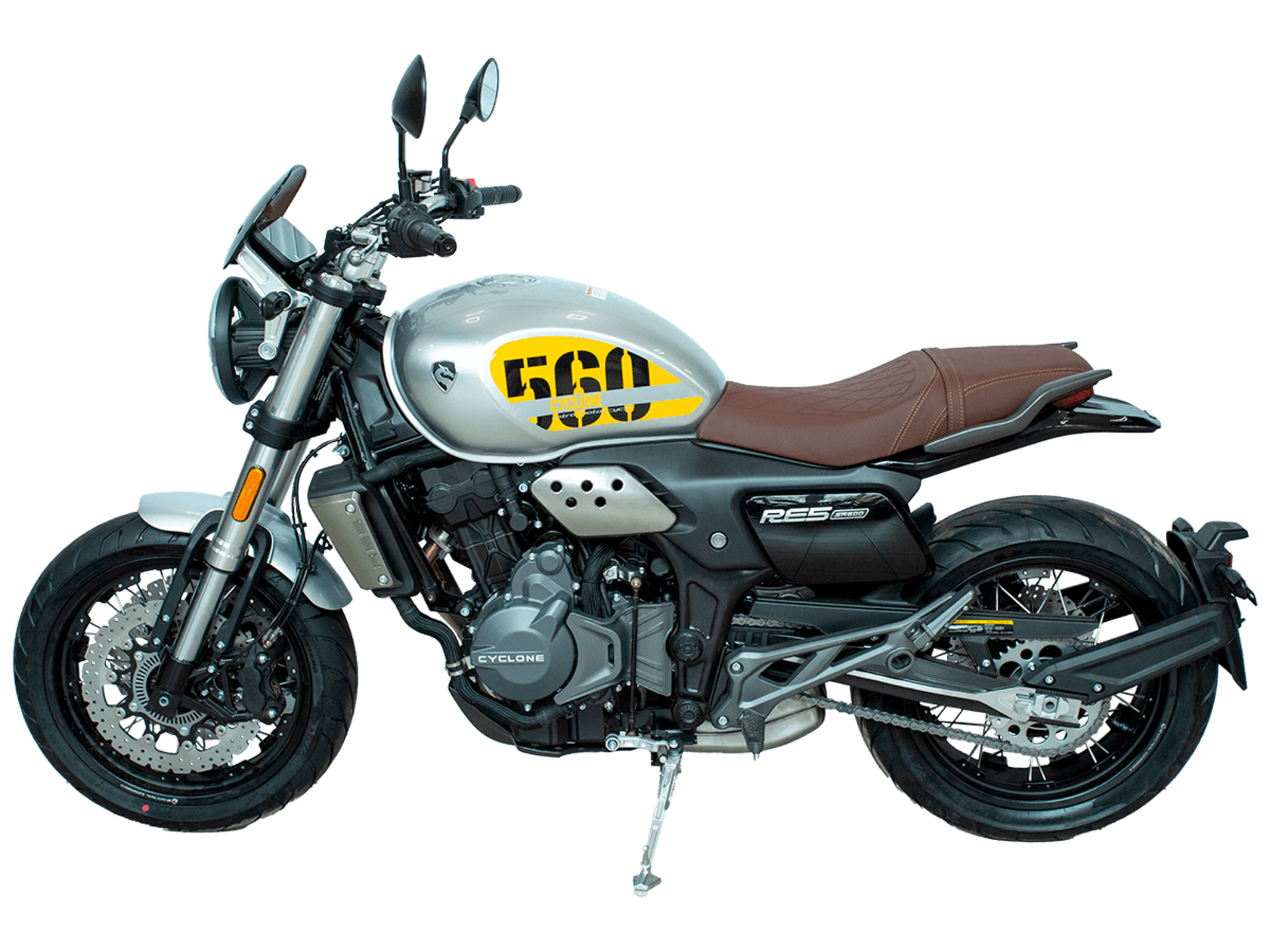 CYCLONE RE5 (SR600) – классик, в котором брутальная простота объединяется с современными технологиями. Данная модель является самой крупнокубатурной среди классических мотоциклов компании CYCLONE.Двухцилиндровый четырёхтактный двигатель объёмом 550 см3 выдаёт 60 л.с. на 8500 об/мин. Максимальный крутящий момент достигается на 6500 об/мин и составляет 55 Н·м. Инжекторный впрыск топлива с блоком управления BOSCH увеличивает топливную экономичность, а также позволяет добиться высокой приёмистости и неприхотливости агрегата. Жидкостная система охлаждения не допустит перегрева двигателя даже при самом агрессивном вождении. На мотоцикл установлена 6-ступенчатая механическая коробка передач.Максимальная скорость мотоцикла составляет 170 км/ч.RE5 оснащён классическими спицевыми колёсами диаметром 17 дюймов. Колёса обуты в бескамерные покрышки от легендарной фирмы PIRELLI. С неровностями дороги эффективно справляются телескопическая вилка перевёрнутого типа спереди и маятник с моноамортизатором сзади. Ход передней подвески составляет 120 мм, задней – 50 мм. Оба компонента подвески являются регулируемыми. Эффективное и безопасное замедление с любых скоростей обеспечивают гидравлические дисковые тормоза с ABS спереди и сзади. Тормозные системы произведены известной испанской фирмой J.JUAN (входящей в легендарный холдинг BREMBO).Клиренс мотоцикла составляет 155 мм. Объём топливного бака – 20 л. Снаряжённая масса – 204 кг.Из дополнительного оборудования можно выделить USB-порт и датчики давления в шинах.Мотоцикл сочетает в себе отличные технические характеристики, комфорт и надёжность, что позволяет вам ощутить настоящую свободу на любой дороге.