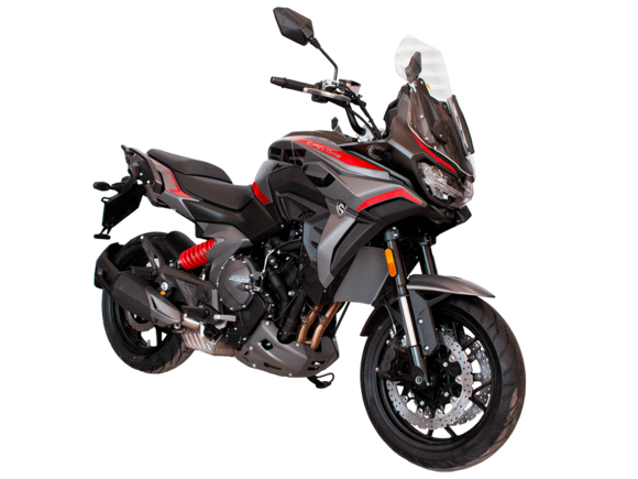 CYCLONE RX6 (SR650) – туристический эндуро для покорения самых непростых и протяжённых маршрутов. Он обладает агрессивным и современным дизайном, который выгодно выделяет его из всех остальных мотоциклов в своём классе. Мотоцикл дарит своему владельцу абсолютную свободу передвижения, позволяя долго и быстро ехать по шоссе, а при желании съезжать на такие дороги, по которым не проедет ни один дорожный мотоцикл. Небольшие габариты этого байка позволяют с успехом использовать его, как повседневный дорожный мотоцикл.Данная модель является самой крупнокубатурной в модельном ряде компании CYCLONE. Рядный двухцилиндровый четырёхтактный двигатель объёмом 650 см3 выдаёт мощность в 71 л.с. на 8500 об/мин. Максимальный крутящий момент достигается на 7000 об/мин и составляет 62 Н·м. Инжекторный впрыск топлива с блоком управления BOSCH увеличивает топливную экономичность, а также позволяет добиться высокой приёмистости и неприхотливости агрегата. Жидкостная система охлаждения не допустит перегрева двигателя даже при самом агрессивном вождении. На мотоцикл установлена 6-ступенчатая механическая коробка передач.Максимальная скорость мотоцикла составляет 180 км/ч.Модель оснащена литыми алюминиевыми дисками диаметром 17 дюймов. Колёса обуты в бескамерные покрышки от легендарной фирмы PIRELLI. С неровностями дороги эффективно справляются компоненты производства культовой японской компании KYB – телескопическая вилка перевёрнутого типа спереди и маятник с моноамортизатором сзади. Ход передней подвески составляет 130 мм, задней – 51 мм. Оба компонента подвески являются регулируемыми. Эффективное и безопасное замедление с любых скоростей обеспечивают гидравлические дисковые тормоза с двухканальной системой ABS спереди и сзади. Тормозные системы произведены известной испанской фирмой J.JUAN (входящей в легендарный холдинг BREMBO).Мотоцикл отличает хорошо продуманная компоновка с высоко расположенным радиатором. Высота 820 мм по седлу позволяет чувствовать себя комфортно даже райдерам небольшого роста. На данной модели установлена металлическая защита выхлопной системы и масляного фильтра. Под пассажирским сиденьем размещён небольшой, но крайне полезный набор инструментов.RX6 (SR650) оснащён бортовым компьютером с информативным цветным дисплеем и кнопками управления на руле, а также двумя штатными видеорегистраторами спереди и сзади. Из других приятных мелочей в допоборудовании мотоцикла стоит выделить регулируемое при помощи кнопки ветровое стекло, датчики давления в шинах, подсветку пультов, бесключевой доступ и 2 USB-порта.Клиренс мотоцикла составляет 165 мм. Объём топливного бака – 20 л. Снаряжённая масса – 245 кг.Мотоцикл сочетает в себе отличные технические характеристики, богатое оснащение, комфорт и надёжность, что позволяет вам ощутить настоящую свободу, отправившись на нём в любое путешествие.