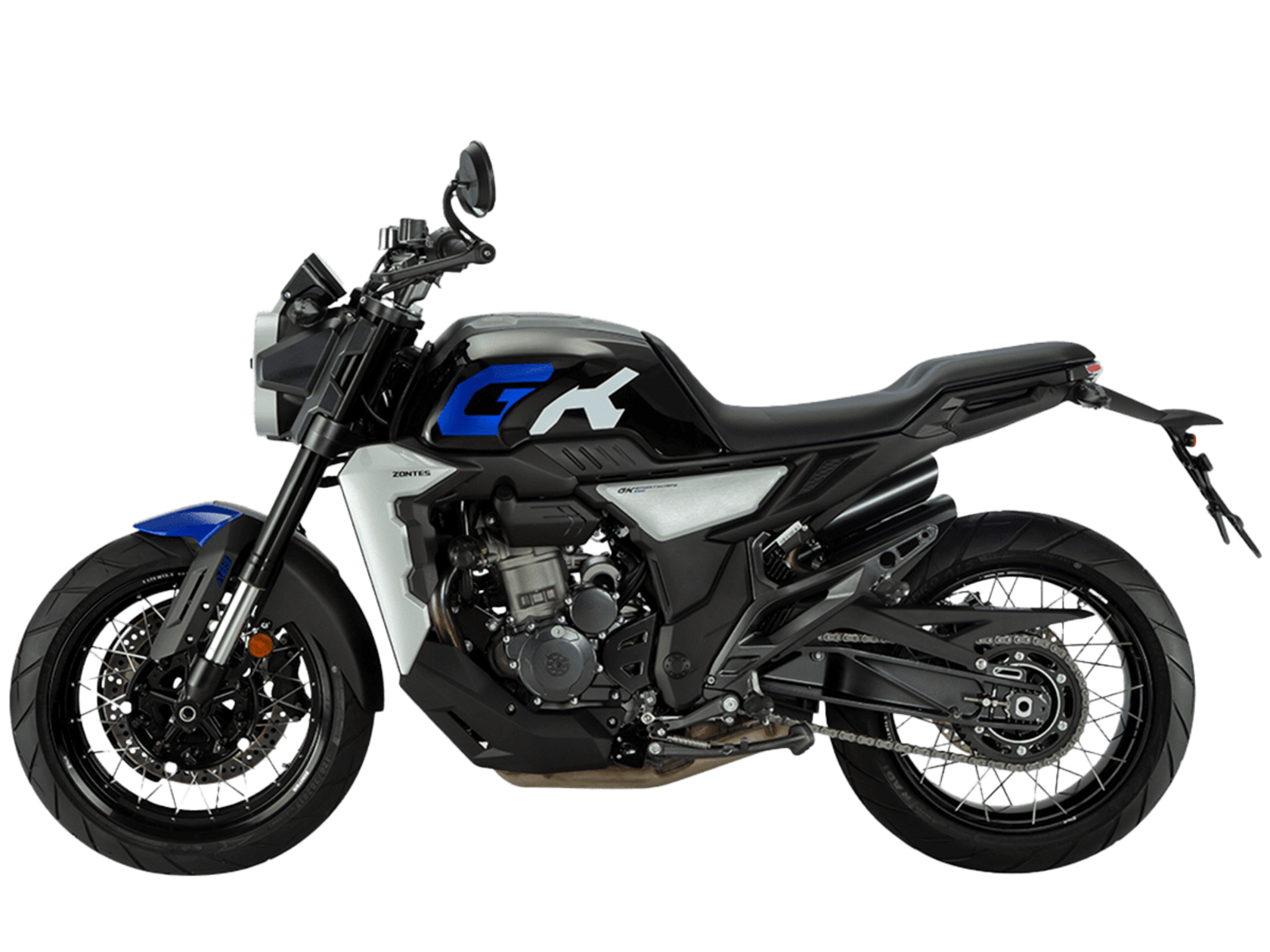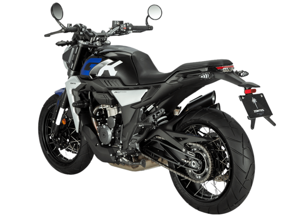 Мотоцикл ZONTES ZT350-GK – современный неоклассик для покорения городских пространств. Хорошо проявляет себя как в тесном межрядье, так и на свободных трассах.Силовая установка представлена одноцилиндровым 4-тактным двигателем ZT184MP с 4 клапанами и 2 верхними распредвалами. Двигатель имеет объём 348 см³ и обеспечивает мощность в 39 л.с. Оснащён инжектором BOSCH и системой жидкостного охлаждения. Механическая коробка передач имеет 6 ступеней и схему 1-N-2-3-4-5-6. Запуск двигателя осуществляется с помощью бесключевого доступа.Ёмкость топливного бака 17 литров.Бескамерные спицованные колёса имеют диаметр 17 дюймов. На мотоцикл установлены датчики давления в шинах, показатели от которых выводятся на приборную панель. Для подвески спереди используется телескопическая вилка, сзади – моноамортизатор. Гидравлические дисковые тормоза произведены испанской компанией J.JUAN, входящей в холдинг BREMBO. Передний тормозной диск скрыт под защитным кожухом.В конструкции мотоцикла используется трубчатая стальная рама. Рычаги тормоза и сцепления, а также лапки КПП можно отрегулировать. Рычаги снабжены защитными скобами. Для освещения используется яркая LED-оптика, а приборная панель представлена цифровым дисплеем. Имеется 2 USB-порта.Габариты мотоцикла 2070х845х1120 мм. Колёсная база 1390 мм. Высота по седлу 795 мм. Вес 169 кг.