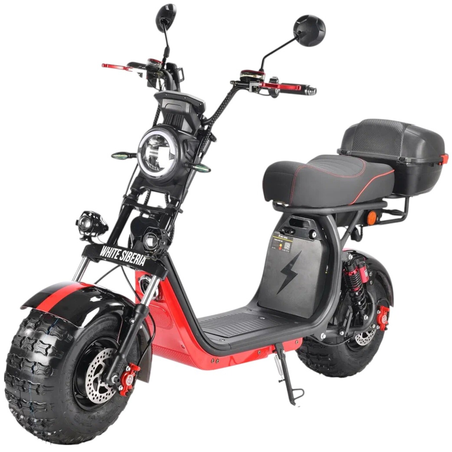 Первый полноприводный скутер WHITE SIBERIA PRO 2WD 4000W класса CityCoco на рынке стран СНГ. Два мотор-колеса мощностью 2000 Вт (суммарная мощность 4000 Вт) в сочетании с полным приводом и 8-дюймовыми колесами позволят Вам преодолеть пересеченную местность без проблем и забот.Данная модель станет лучшим выбором для охотников, рыболовов и любителей путешествий по бездорожью. В кофре Вы без проблем уместите габаритный груз, а в бардачок под сиденьем сможете положить документы, деньги и другие ценные вещи. Эта практичная и стильная модель непременно порадует Вас и подарит множество приятных поездок как в условиях города, так и за его пределами.Преимущества:LED-оптика яркая, заметная и потребляет электричество экономно;Настраиваемые ручки тормоза позволяют подобрать идеально удобное положение;Скутер может проехать до 80 км на одном заряде при комплектации двумя батареями;Сиденье мягкое, широкое, удобное и прекрасно подходит для длительных поездок.Верх сиденья отделан прочной и долговечной эко-кожей, которая устойчива к воздействию влаги и ультрафиолета;Бокс выполнен из прочного пластика и снабжен дополнительным фиксатором верхней крышки;Установлен большой LED-дисплей;Колеса с дорожной резиной.Состоит из светодиодных ламп. LED-оптика яркая, заметная и потребляет электричество экономно. Она обеспечивает отличное освещение и безопасность при движении на дорогах. Ручки газа выполнены из алюминия с каучуковым покрытием, прочным и прочным на ощупь. Настраиваемые ручки тормоза позволяют подобрать идеально удобное положение. Интуитивно понятные кнопки переключения скоростей и света выполнены в классическом стиле.Скутер может проехать до 80 км на одном заряде при комплектации двумя батареями. При классической комплектации одной батарей — до 50 км. Батарея сертифицирована и обладает умной BMS платой 40A, которая защищает АКБ от перезаряда и перегрузки. Классическое сиденье, единое для всей линейки моделей WS. Оно мягкое, широкое, удобное и прекрасно подходит для длительных поездок. Верх сиденья отделан прочной и долговечной эко-кожей, которая устойчива к воздействию влаги и ультрафиолета.Бокс выполнен из прочного пластика и снабжен дополнительным фиксатором верхней крышки. Усиленный держатель бокса способен выдержать нагрузку до 50 кг.В корпус встроен катафот и предусмотрено место для установки дополнительного света. Вы можете демонтировать бокс и установить на его место классическую спинку для второго пассажира, которая идет в комплекте. На модели установлен большой LED-дисплей, отображающий скорость, заряд батареи, индикатор света и пройденную дистанцию. В стандартной комплектации поставляется на 8-дюймовых колесах с дорожной резиной. Для поездок по пересеченной местности и серьезного бездорожья рекомендуется установка комплекта грязевой резины.