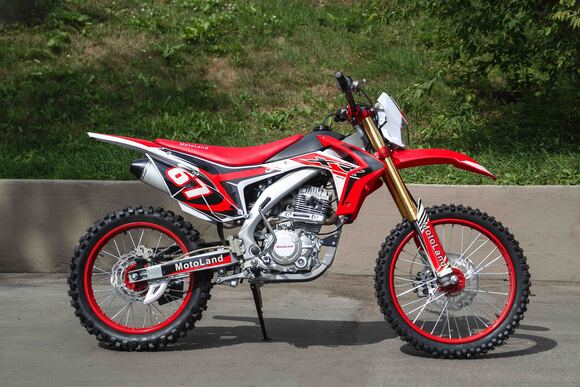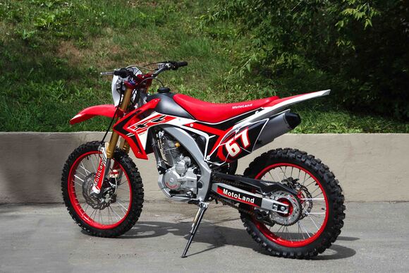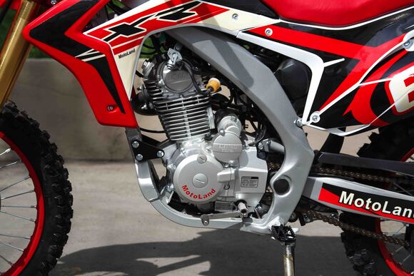 Купить Motoland 250 XR250 в стандартной комплектации будет неплохим решением для всех, кому нужен недорогой кроссовый мотоцикл, подходящий для езды по бездорожью, без выполнения прыжков и базовых трюков. Хорошее качество сборки и доступные цены на комплектующие позволяют поддерживать технику в исправном состоянии без больших затрат при любой интенсивности эксплуатации. Масса мотоцикла составляет порядка 130 кг. Габариты довольно большие – длина составляет 2000 мм., а высота по седлу – 920 мм., ширина руля- 830 мм. поэтому он отлично подойдет для тех, кто имеет рост от 175 см и выше.На мотоцикле установлен обычный для китайских кроссовых мотоциклов двигатель 169 FMM с 17 л.с. мощности, с воздушным охлаждением и рабочим объемом 230 кубов . Диаметр поршня движка составляет 65,5 мм, балансирный вал в конструкции не предусмотрен. Коленвал у мотоцикла Motoland XR 250 имеет палец диаметром 15 мм. Новые партии оснащаются карбюраторами PZ 30 с ускорительным насосом. Для удобства запуска мотора предусмотрен электростартер.Рычаги сцепления и тормоза – обычные, не складные. Передний тормозной диск имеет размер 280 мм., а размер заднего диска составляет 250 мм. Данный мотоцикл комплектуется колесами размерами 18/21 дюймов, размер задней покрышки – 110/90-18, передней- 80/100-21. Установлена 520-я цепь, передняя (ведущая) звезда имеет 13 зубов, задняя (ведомая) – 41 зуб.Подвеска у данной модели имеет стандартную прогрессию, как у большинства «китайцев». Размеры сальников прогрессии – 32х17х4, размеры подшипников – NK 17/16. Передние амортизаторы имеют размеры L=870 d51x55 мм., а задний – 460 мм, регулировки не предусмотрены. Задний маятник мотоцикла тоже стандартный, металлический.У модели Motoland XR 250 руль имеет переменное сечение: в месте установки его размер составляет 28 мм, а на концах под грипсами – 22 мм. Перевернутая вилка позволяет легче преодолевать любые неровности на дороге даже новичкам.Мотоцикл оснащен фарой головного света, что является необходимым условием для езды в сумерках и темноте. Если он покажется вам недостаточно ярким, вместо стандартной лампы можно установить LED освещение или Биксенон. Переключение света осуществляется ключом зажигания.