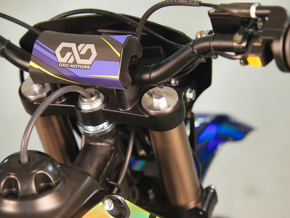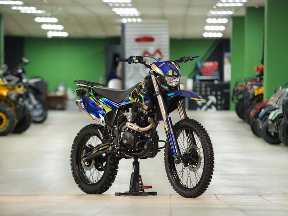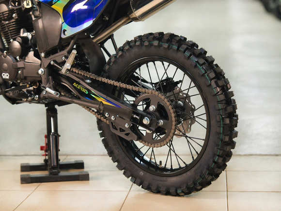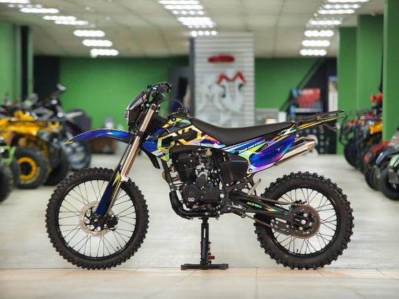 ДвигательДвигатель ZS165FMM - 4-тактный двигатель воздушного охлаждения объёмом 223 куб см с двумя клапанами, оснащён балансировочным валом, благодаря которому уменьшается избыточная вибрация, передаваемая от двигателя на раму и общую конструкцию техники. Характеризуется хорошей тягой с самых низов и лёгким пуском с помощью электростартера. Двигатель отлично зарекомендовал себя в качестве надёжного, универсального, неприхотливого мотора с хорошими характеристиками.РамаРама мотоцикла OXO производится из труб шестигранного сечения хром-молибденовой стали, которая является очень прочной и легкой. Геометрия рамы, благодаря правильно выверенному центру тяжести и углу наклона вилки - способствует наилучшей управляемости устойчивости мотоцикла на низкой скорости.ПодвескаПередняя вилка перевернутого типа. Мотоцикл снабжен моноамортизатором, который соединен посредством системы рычагов прогрессии. Система прогрессии, обеспечивает равномерную, мягкую работу и увеличивает длину рабочего хода подвески.КолесаРазмер передней покрышки: 80/100-21. Размер задней покрышки: 120/100-18. Они прекрасно себя ведут по песку и грязи, что позволяет райдеру отлично показать себя на пересеченной местности.Тормозная системаТормозная система мотоцикла - полностью гидравлическая с армированными шлангами. Спереди и сзади установлен двухпоршневой суппорт. Данная конфигурация тормозных механизмов, позволит быстро и безопасно остановиться с максимальной скорости даже на бездорожье.РульВажная часть современного эндуро мотоцикла - усиленный руль переменного сечения. На руле установлен рычаг заслонки подсоса. Алюминиевая ручка газа с коротким ходом имеет регулировку троса. Также мотоцикл укомплектован электронной панелью приборов.