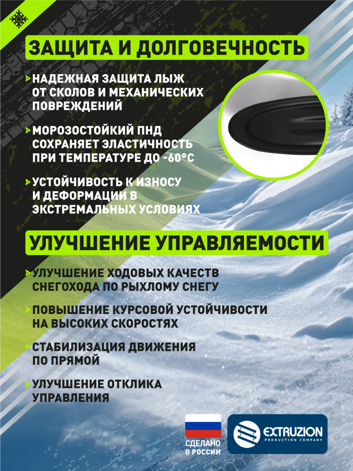 Надежная защита и долговечность. Защищает оригинальные лыжи от сколов, царапин и абразивного износа Изготовлена из морозостойкого ПНД, сохраняющего гибкость при температуре до -60C Принимает на себя основную нагрузку, значительно продлевая срок службы штатных лыж