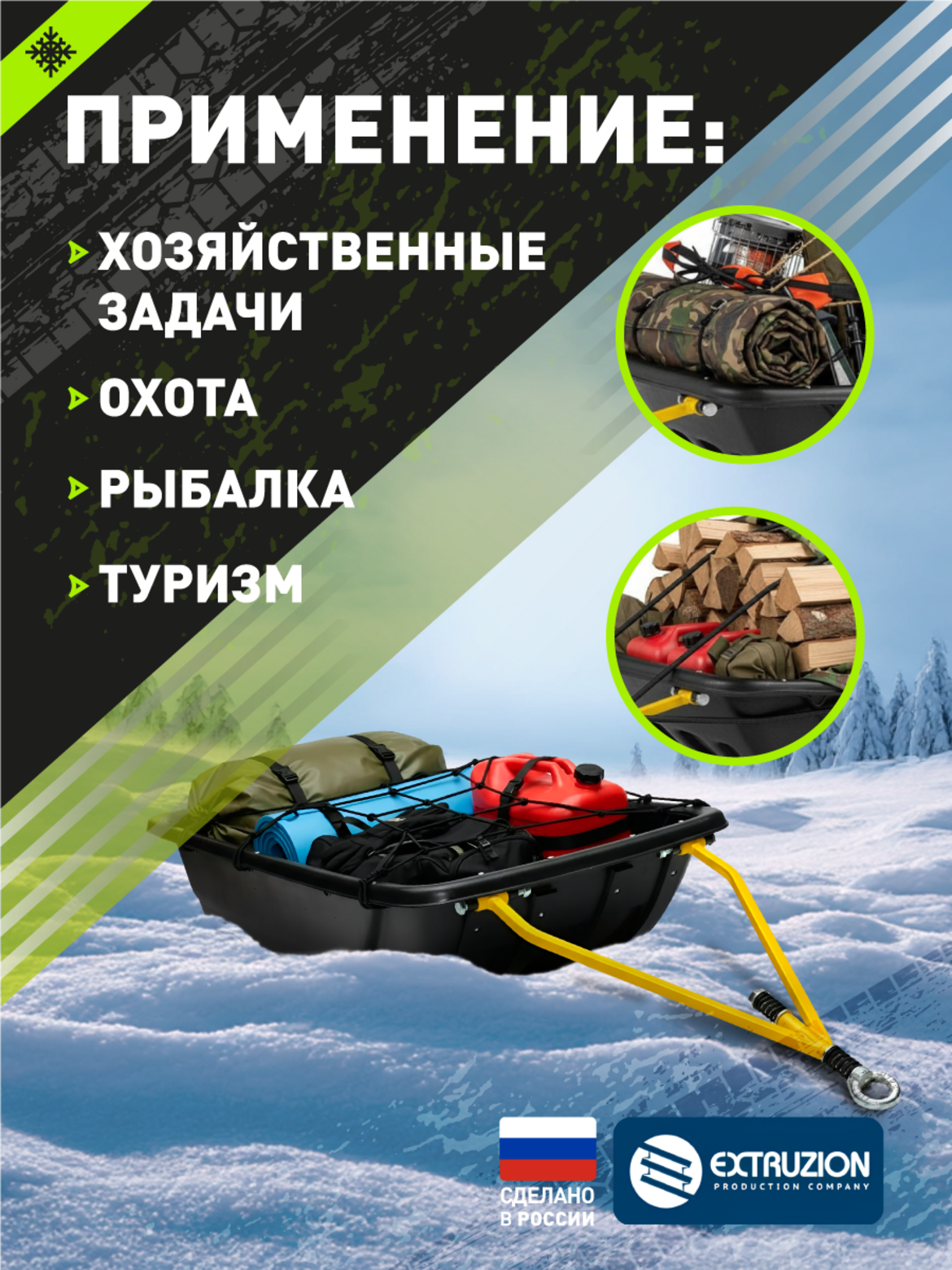 Мощные сани-прицеп премиум-класса, укомплектованные для перевозки крупных грузов снегоходами и мотобуксировщиками. Полная готовность к работе в экстремальных условиях.
